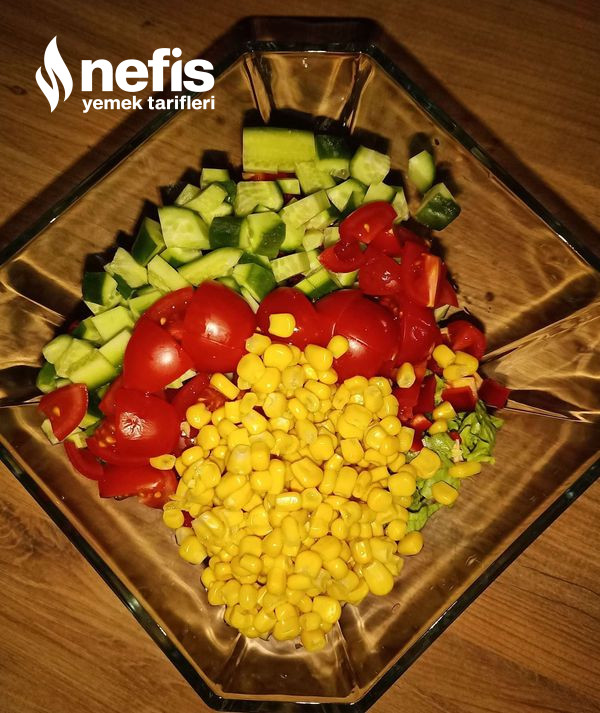 7. Tüm zerzevatları doğrayalım. Haşlanan makarna ve mısırı da ekleyelim.