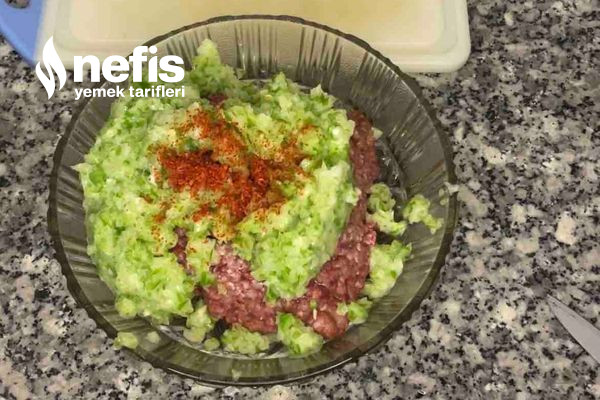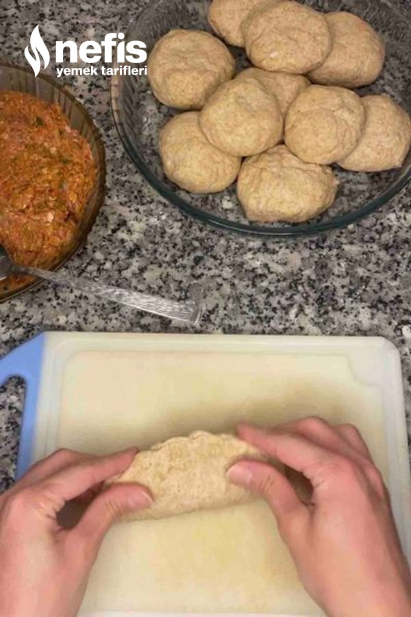 - Kıyma düzgünce hamur ile bütünleşince elimizde hamuru çekerek uzatalım üstüne bastırıp hamuru yayalım.
