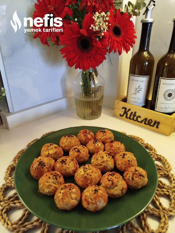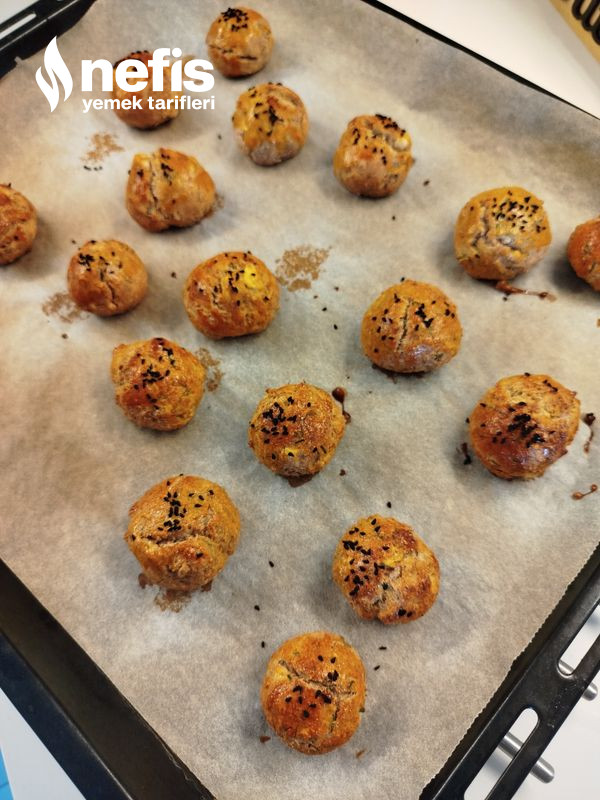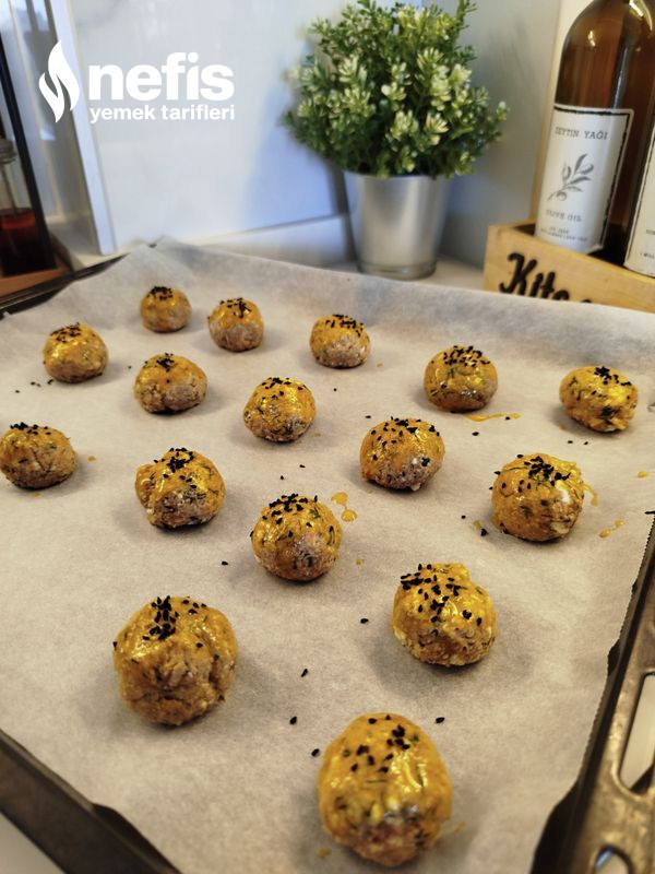 4. Dolaptan çıkardıktan sonra ceviz büyüklüğünde modüller alıp yuvarlayalım. Yağlı kağıt serili tepsimize dizelim. Üzerine yumurtasını sürüp çörek otu serpelim.