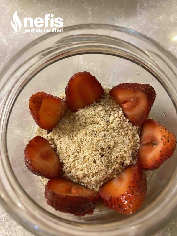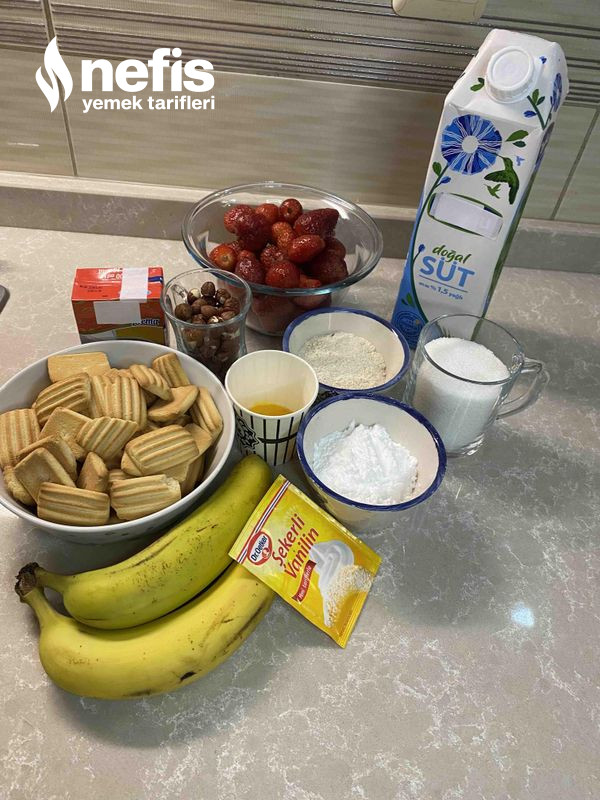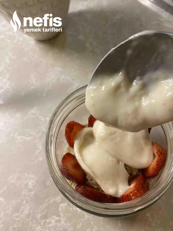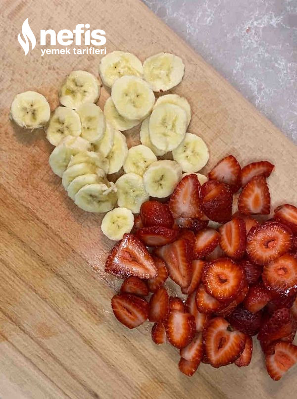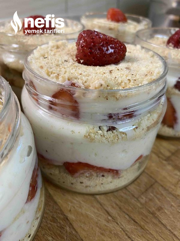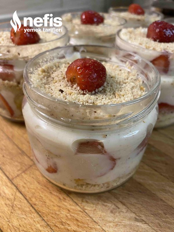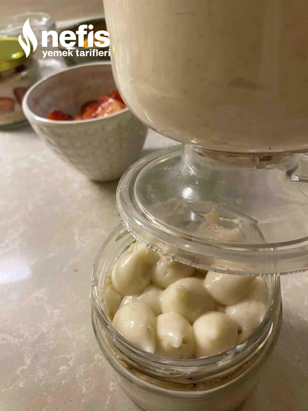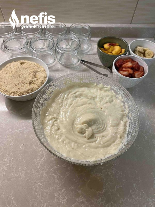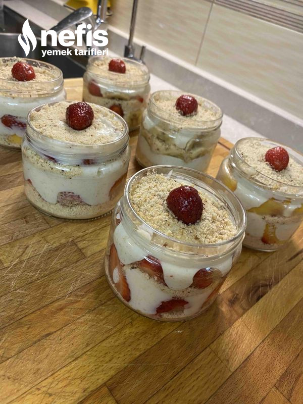- Ben kavanozda yaptım lakin siz kuplara da yapabilirsiniz, altına bisküvi yanlara meyveler ve ortasına muhallebi olacak formda koyalım. En üzerine tekrar bisküvi koyup meyve ile süsleyelim.