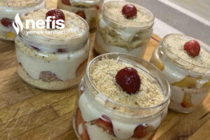 - Ben kavanozda yaptım lakin siz kuplara da yapabilirsiniz, altına bisküvi yanlara meyveler ve ortasına muhallebi olacak formda koyalım. En üzerine tekrar bisküvi koyup meyve ile süsleyelim.