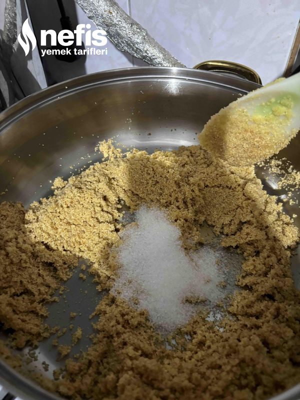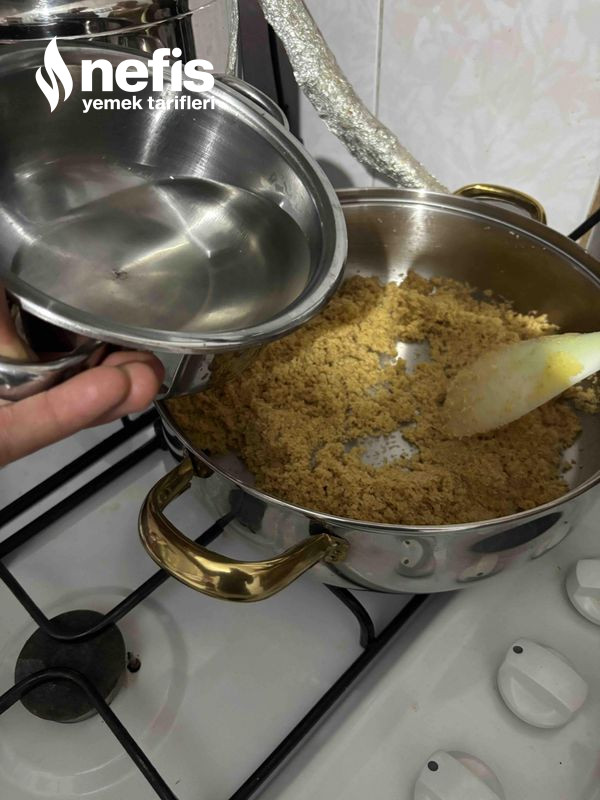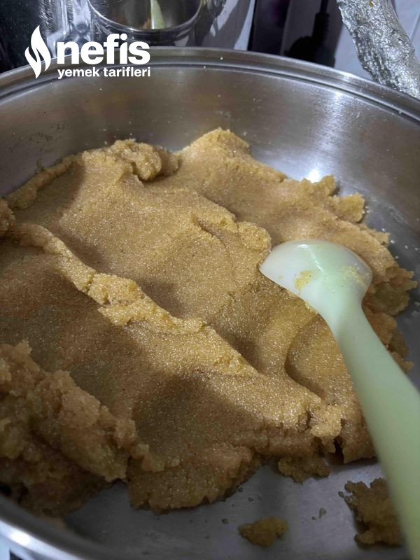 4. Şekerden ayırdığımız kısmı rengi dönen kavrulan irmiği ekleyip, kavurmaya devam edelim.