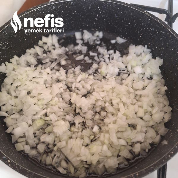 1. İlk olarak iç harcını hazırlıyoruz; tencereye aldığımız ince ince doğranan soğanları sıvı yağda kavuruyoruz.