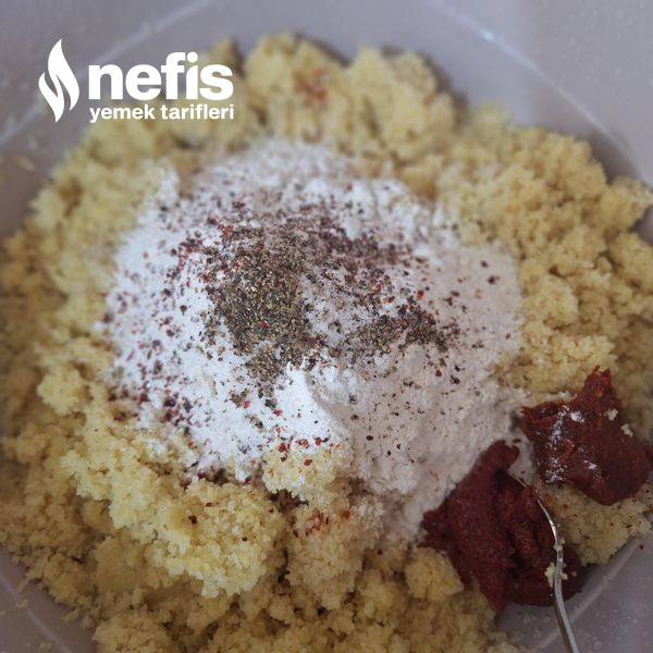 7. Yumuşayan bulgura öteki gereçlerimizi ekleyelim ;yumurta,un ,salça,baharat ve yoğurmaya başlayalım.