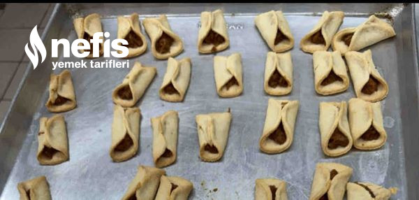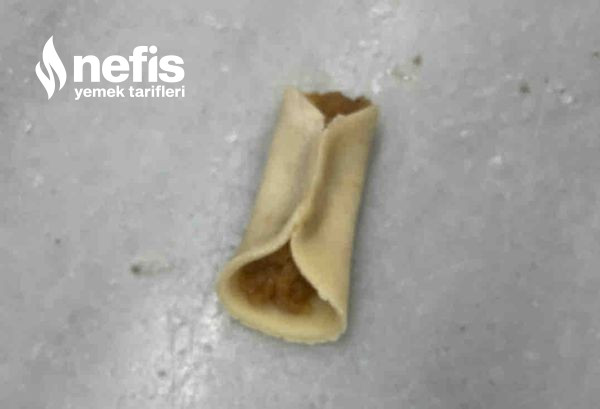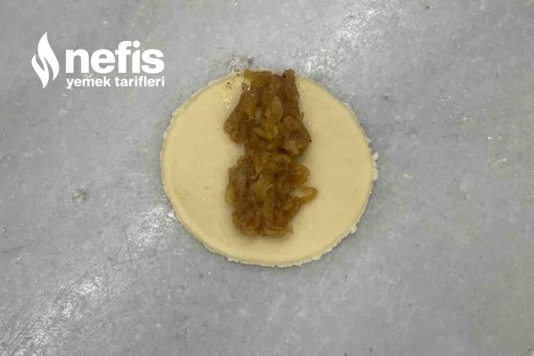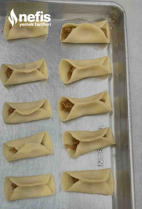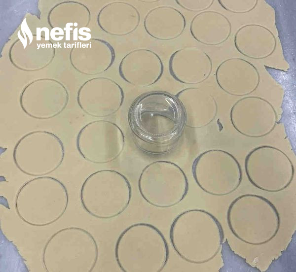 - Şekil vermek için; hamurdan ceviz büyüklüğünde modüller alalım yahut merdaneyle açıp su bardağının ağız kısmıyla keselim. Ortasına harç koyup kapatalım. Fırın tepsisine dizelim.