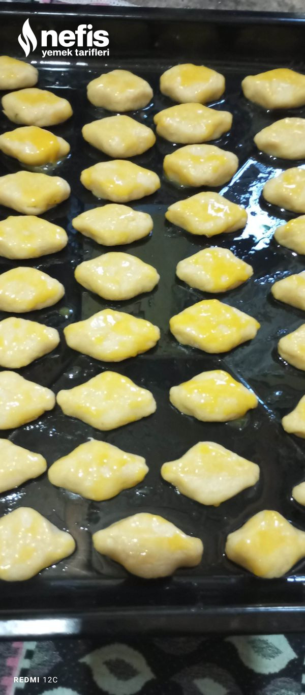4. Hamurdan ceviz büyüklüğünde kesimler alıp elinizde istediğiniz biçimi verip yağlanmış tepsiye dizin.