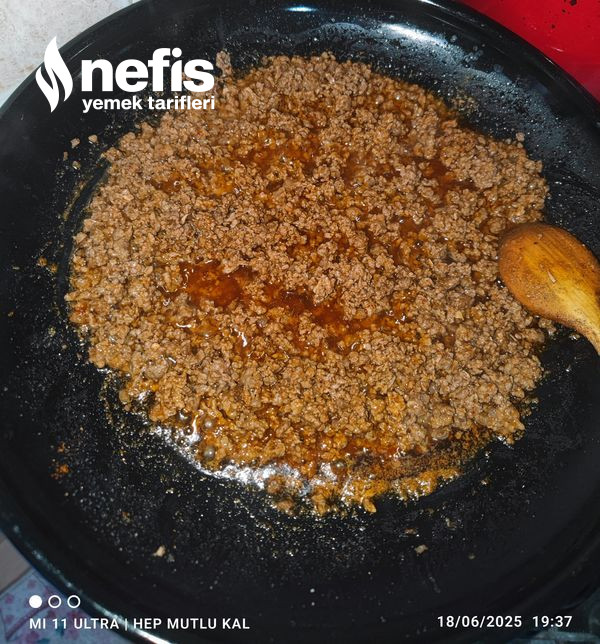 - Kıymayı sacın içinde yanmayacak kadar su ile pişine kadar karıştırarak pişirin.