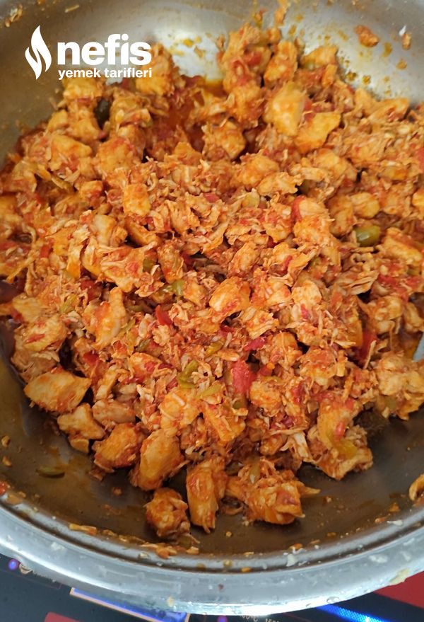 - Tavuk göğsünü küp küp doğrayın ve tavada pişirin akabinde tuz sıvı yağ pul biber salça ekleyin ekleyip pişirin.