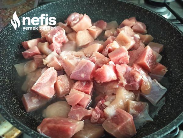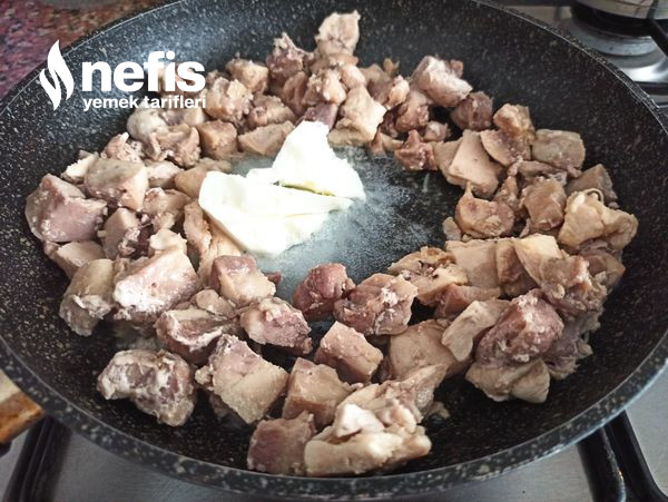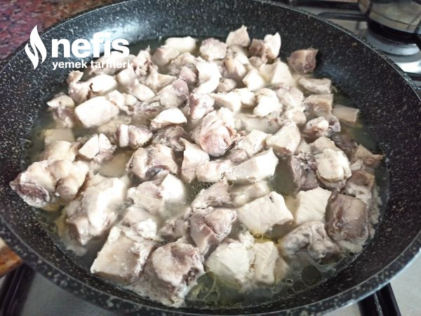 1. Öncelikle tavukları küçük küp biçiminde doğrayalım. Tuz ekleyip 1 çay bardağı su ile suyunu çekene kadar pişirelim.