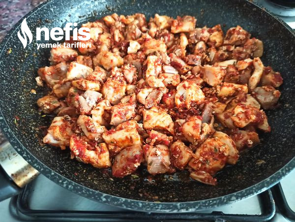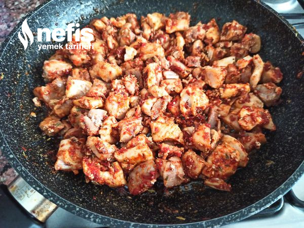 3. Biraz tavada çevirdikten sonra tantuni hazır. Olağanda lavaş, domates vs ile birlikte tüketiliyor. Lakin ben bu halde yapıp pilav yanında ya da patates yanında tüketiyorum. Çok daha lezzetli oluyor. Denemeye bedel :).