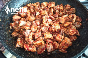 1. Öncelikle tavukları küçük küp biçiminde doğrayalım. Tuz ekleyip 1 çay bardağı su ile suyunu çekene kadar pişirelim.