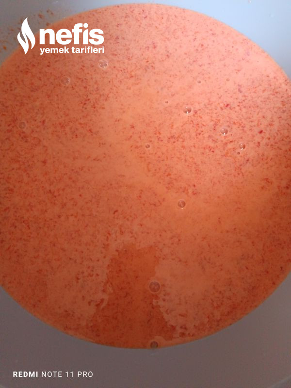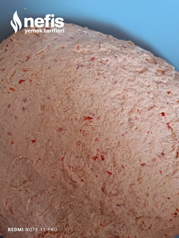 - Geniş bir leğene süt ,yoğurt domates ve biberleri ekleyip karıştıralım. 10 yemek kaşığı tuzu ekleyip güzelce karıştırıp unu ekleyelim.