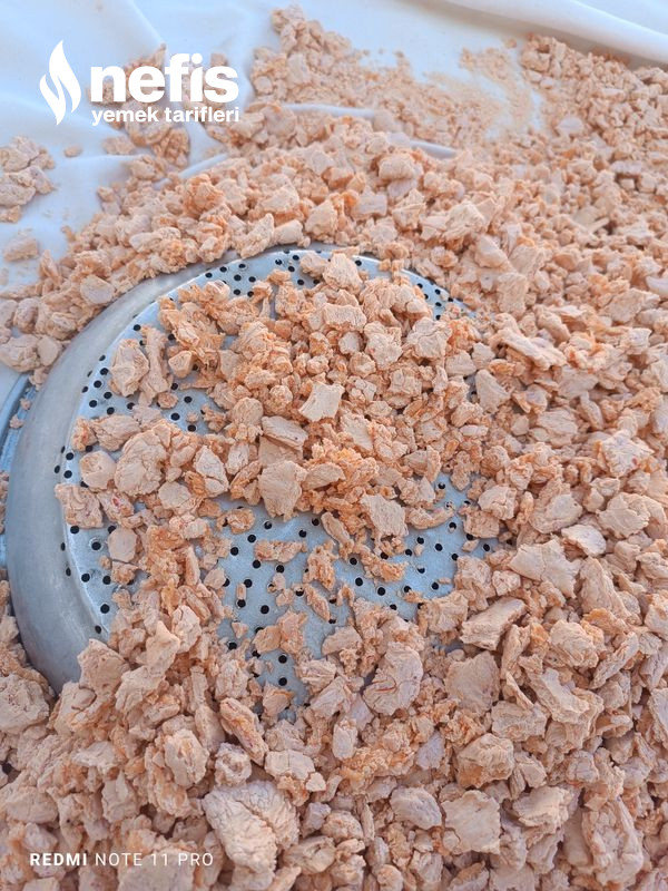- Hamur kesimlerinin gereğince kuruduğundan emin olunca kalbur ( delikli ) zıt çevirip üzerine bir kesim alıp elimizle ufalalım. Bu basamakta eldiven kullanmanızı tavsiye ederim ellerimiz hassas olduğu için tahriş olmasın diye.