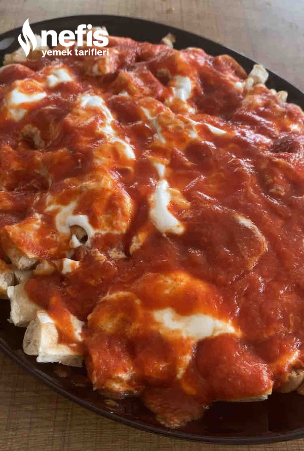 - Servis tabağına evvel tırnak pide sonra yoğurt sos ve domates sos ekliyoruz.