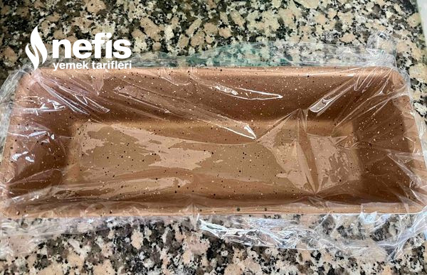 - Dilediğiniz bir pasta kalıbının tabanını streç sinema ile kaplayıp bisküvili harcı dökelim.