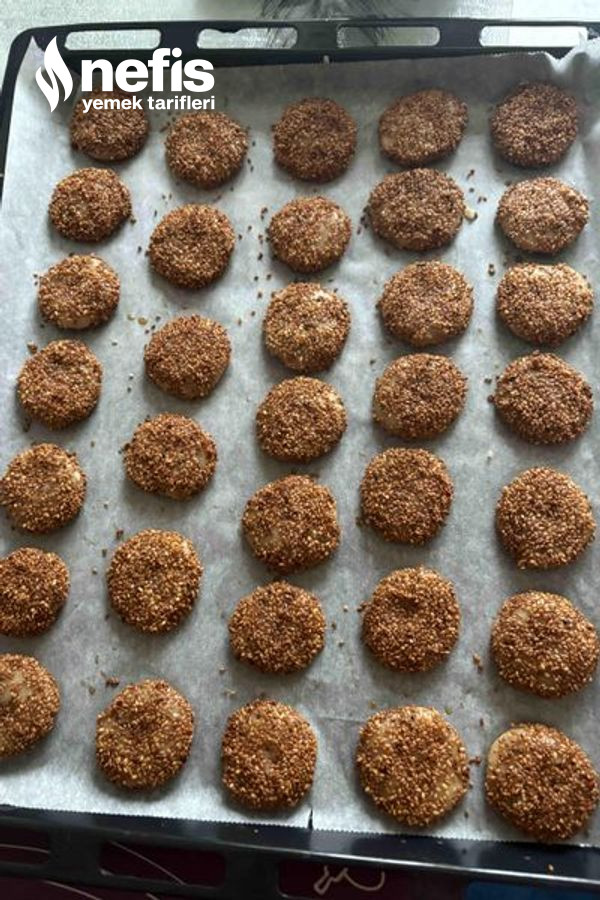 - Dizilen hamurlar evvel pekmezli suya akabinde susama batırılır.