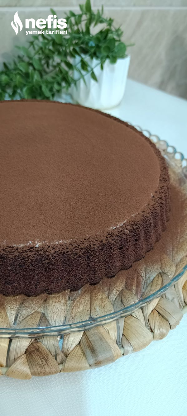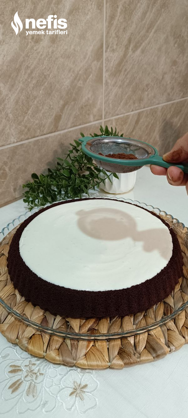 13. Krema soğuduktan sonra kekin üzerine dökün ve en son türk kahvesiyle kakaoyu karıştırıp süzgeçten eleyerek kremanın üzerine hakikat serpin.