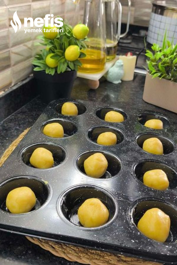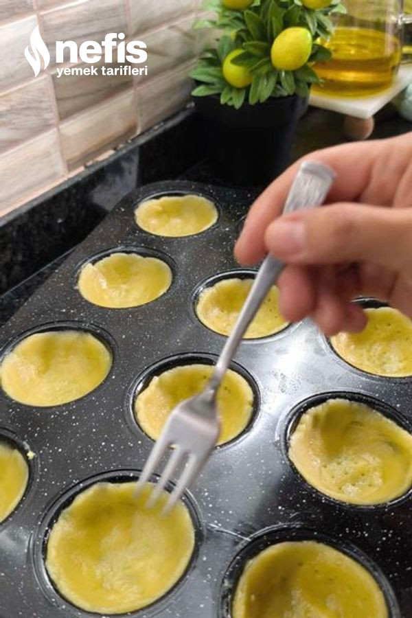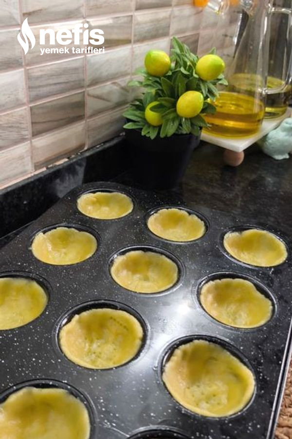 - Tartolet hamurlarından ceviz büyüklüğünde kesimler koparıp muffin kalıbına çanak olacak formda yerleştirin. ( ben kalıbımı tereyağı ile yağladım).