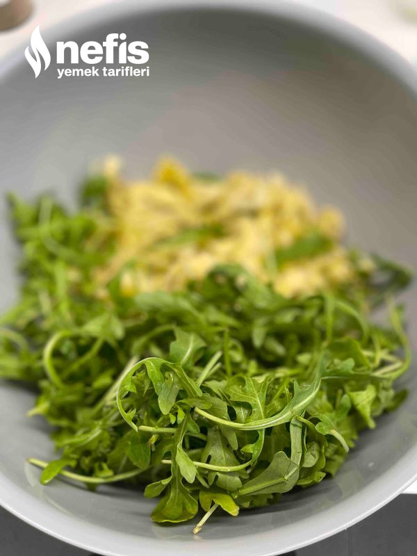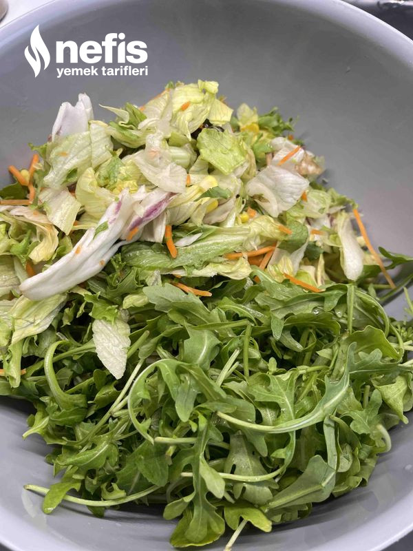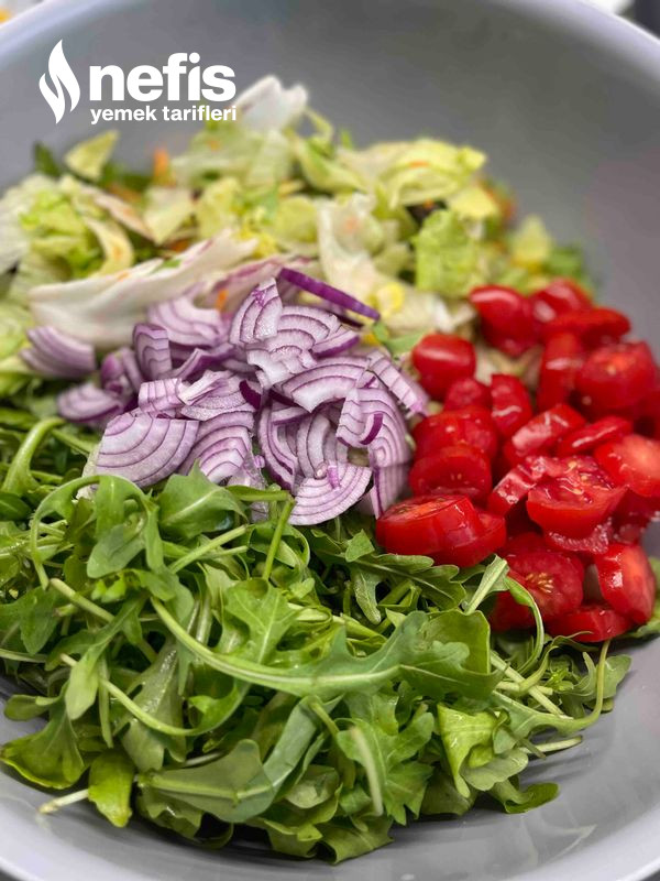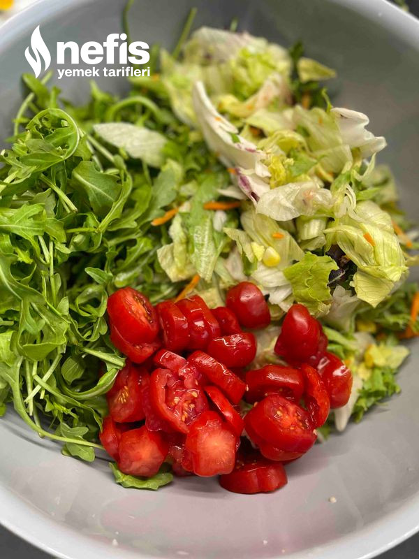 - Karışık yeşillikler ve roka ile birlikte geniş bir salata kasesine alın.