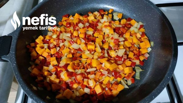 - Sırasıyla tatlı patatesi ve kırmızı biberi de tavaya ekleyin ve her birini birkaç dakika kavurun. Her zerzevatla birlikte azar azar tuz ekleyin.