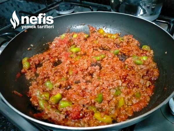 - Kıyma tavaya alınır, suyunu salıp çekene kadar kavrulur, olabildiğince ufak doğranmış soğan ezilmiş sarımsak ve sivri biber zeytinyağı ile birlikte tavaya alınır.
