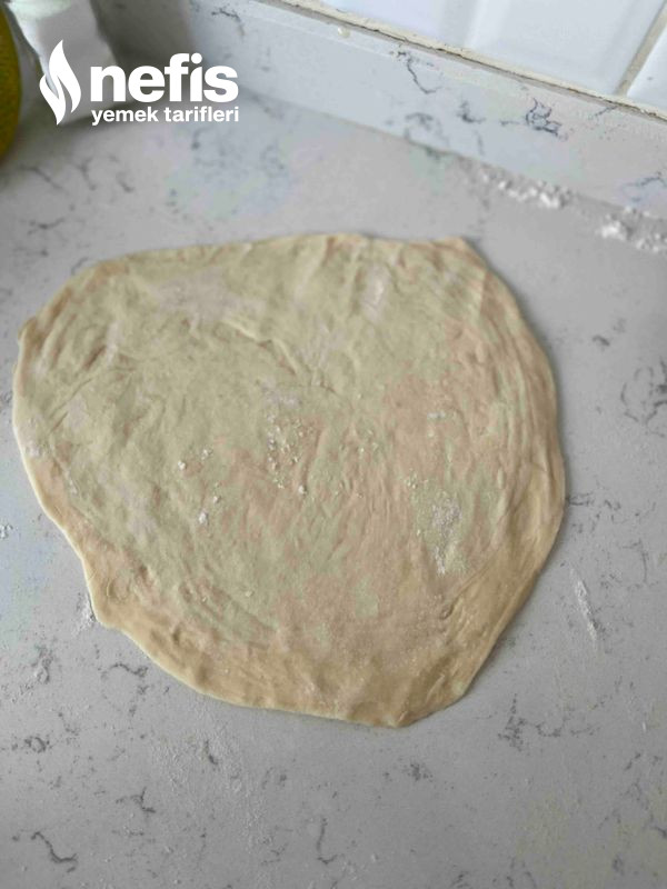 9. Tezgaha çok az un serpelim ve hamurumuzun 1 adedini alarak merdaneli yardımı ile tavanın boyuma nazaran açalım.