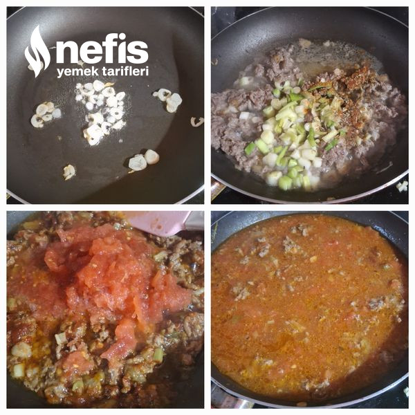 - Öncelikle sıvı yağda kuru soğan ve sarımsakları pembeleşinceye kadar kavuruyoruz (ben kuru soğan yerine taze soğan kullandığım için bu etapta yalnızca sarımsak kavurup süratlice öbür basamağa geçtim)
