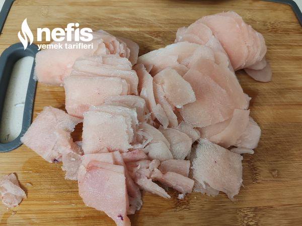 1. Buzluktan çıkardığımız hafif çözünmüş tavuğu ince ince dilimleyelim.