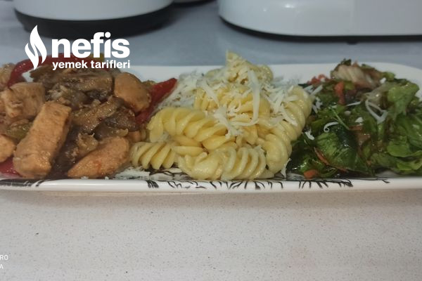 - Servis tabağının bir kenarına tavuk sote, bir kenarına salata, ortalarına da makarna olacak formda servis edilir. Afiyet olsun.