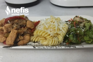 - Servis tabağının bir kenarına tavuk sote, bir kenarına salata, ortalarına da makarna olacak formda servis edilir. Afiyet olsun.