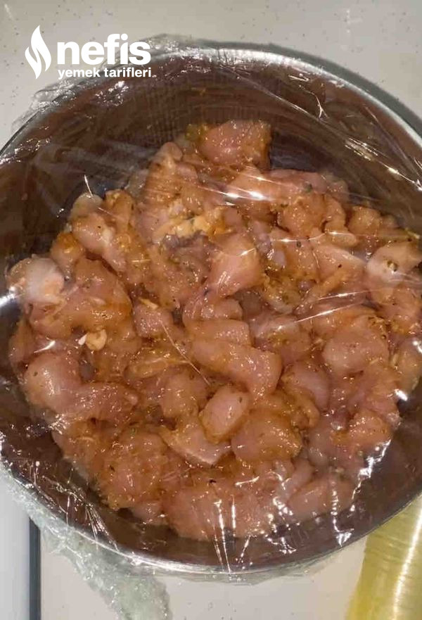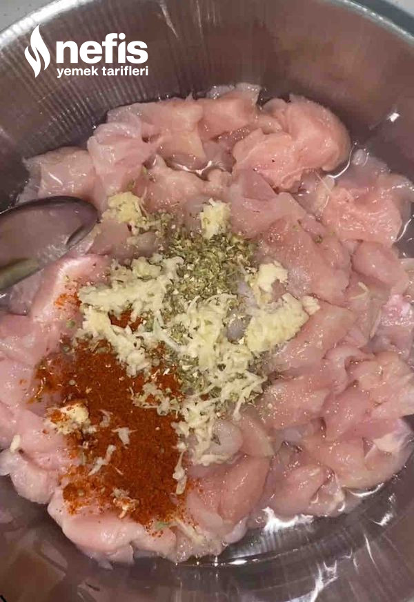 1. Öncelikle tavuklarımızı dilimleyip baharatlarımızı ekleyelim.