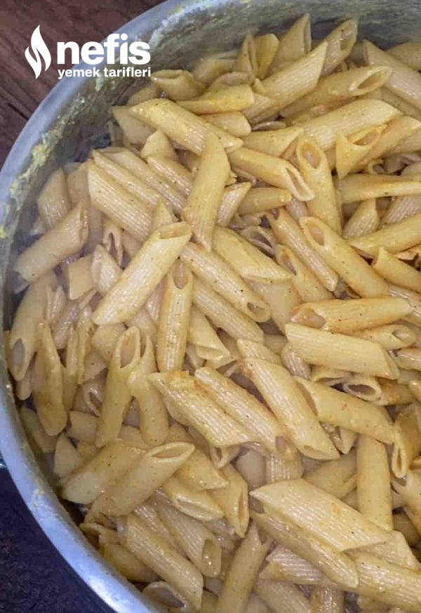 7. Haşlanan makarnalarımızın suyunu süzüp krema ve köri ile birleştirelim.