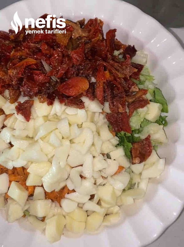 8. Salatamız için ise marul ve rendelediğimiz havuçları akabinde peyniri ve ıslattığınız kuru domatesleri birleştirip, üzerine tuz, limon ve isteğe nazaran biraz nar ekşisi dökelim.
