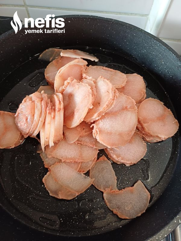 - Donan tavuk ince ince doğranır sıvı yağda tavuk pişene kadar kavrulur.