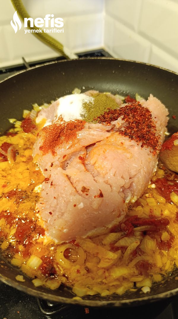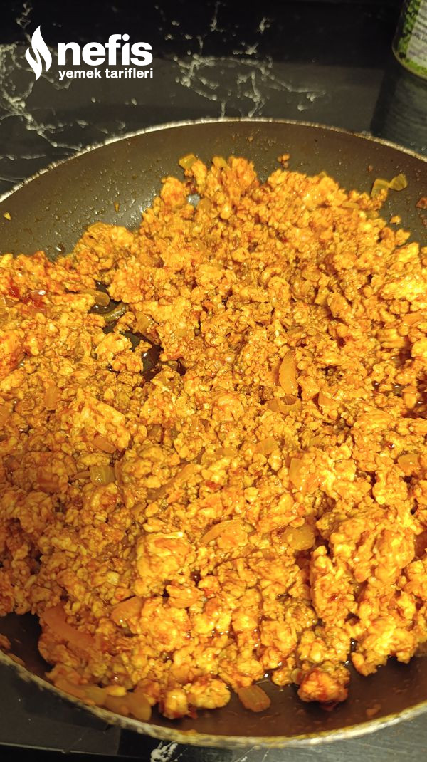 2. Üzerine tavuk kıyması mı baharatları ve tuzu da ekleyerek pişiriyoruz.