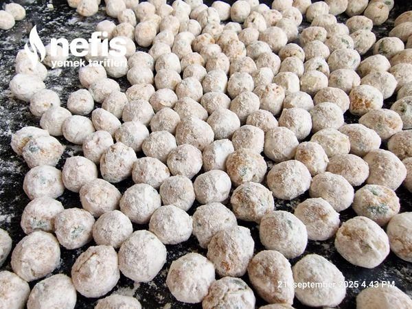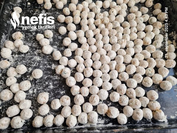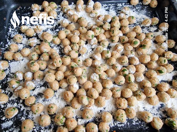 2. Avuç içi su ile ıslatılarak köfteler küçük yuvarlanır ve unlu tepsiye eklenir.