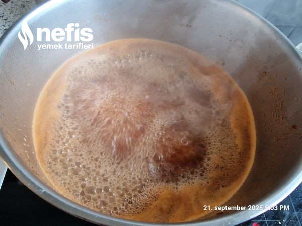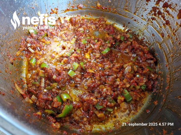 5. Baharat, tuz ve salça eklenerek güzelce kavrulur, akabinde su ek edilip kaynatılır.