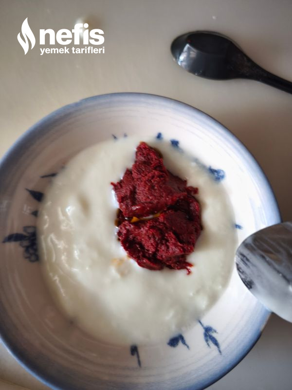 - Sosu için; sıvı yağ,yoğurt ,salça ,ketçap köri ve baharatlarımızı ekleyip, karıştıralım.