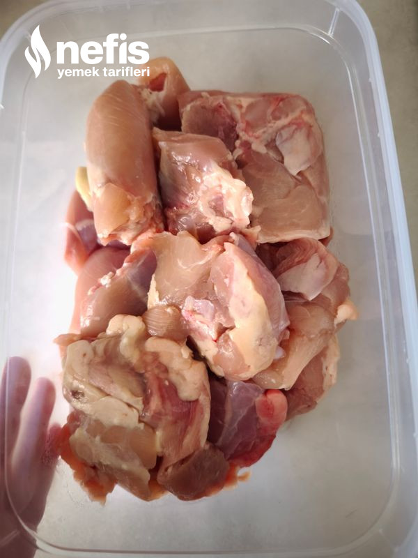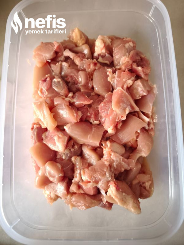 - Tavukları küp küp doğrayalım. Bir tatlı kaşığı tuzumuzu ekleyelim.