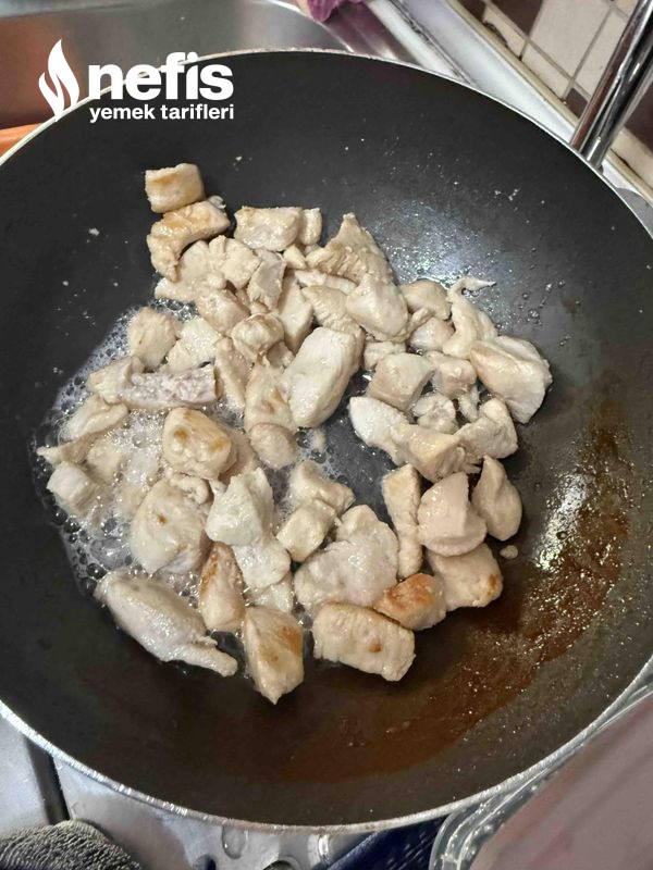 - Tavukları rengi değişene kadar sıvı yağında kavuralım hafif kızarsın.