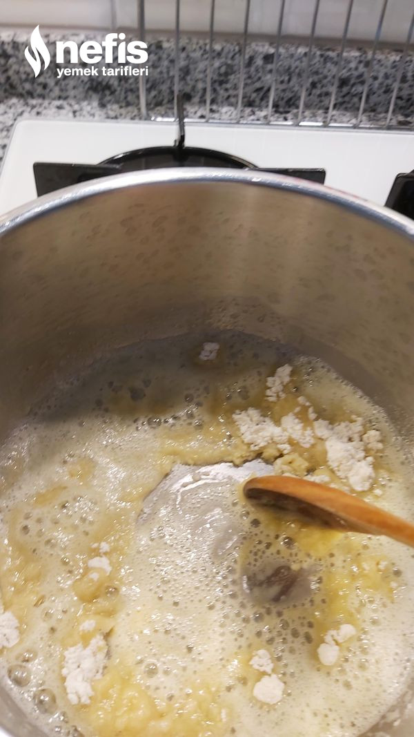 2. Diğer tarafta çorbayı pişireceğimiz orta uzunluk bir tencereye teteyağ ve zeytinyağı koyalım, eriyince 1 kaşık unu koyup, kokusu çıkana kadar kavuralım.