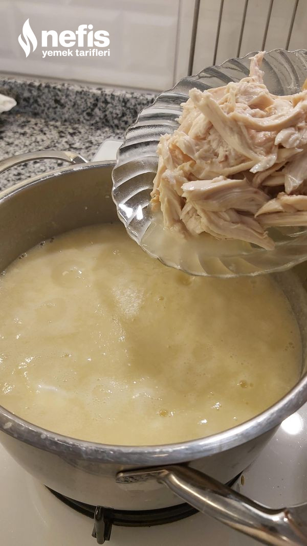 3. Tavuğu haşladığımız suyu ekleyelim karıştıralımk8 un topaklanmasın kaynamaya başlayınca tel şehriyeyi ekleyelim, şehriyeler pisince yani yaklaşık 7-8 dakikada pişiyor.