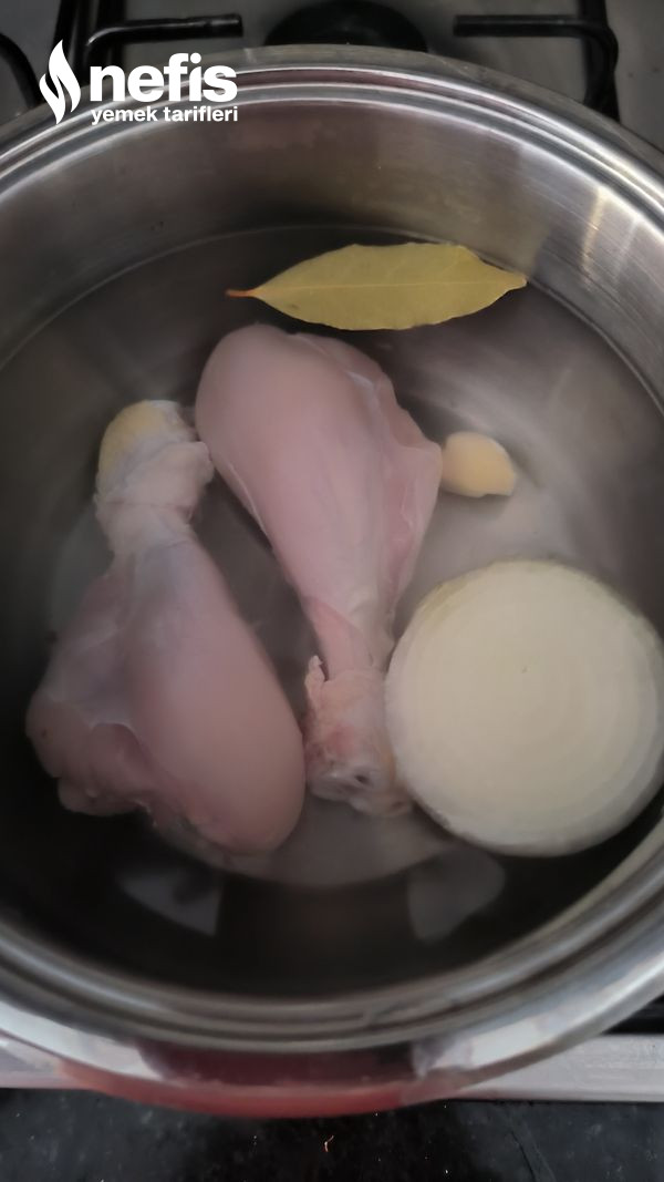 - Tavuk, bütün halde kabuğu soyulmuş soğan ve sarımsak, aroma için defne yaprağı eklenir.