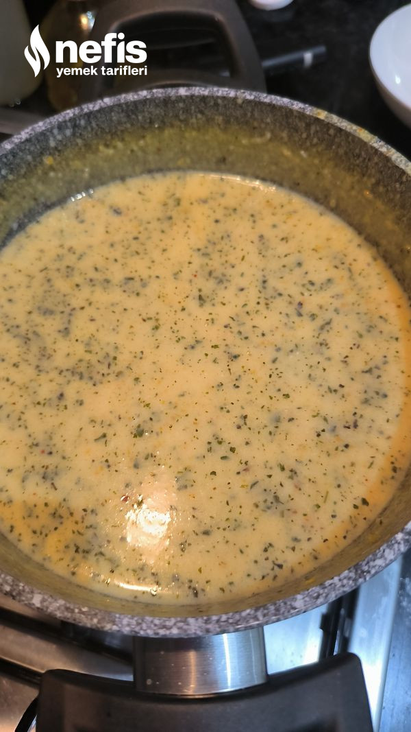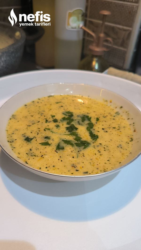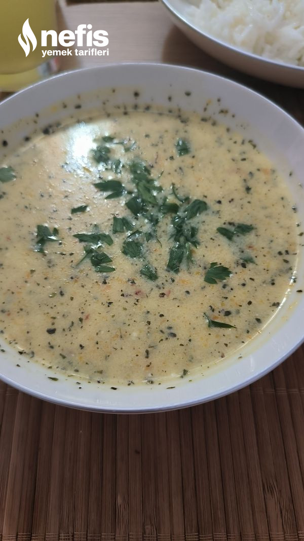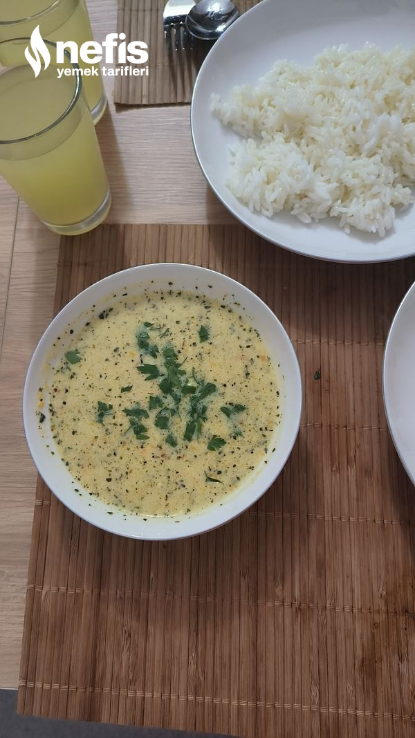 - Terbiyesi hazırlanır: farklı bir kapta yoğurt, yumurta sarısı, limon suyu yeterlice çırpılır. Bir kepçe çorbadan eklenir karıştırılır bir kepçe daha eklenir karıştırılır. Daha sonra yavaş yavaş eklenir süratlice karıştırılır bir yandan.
