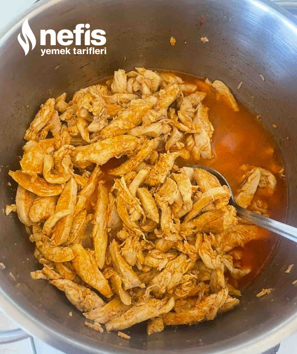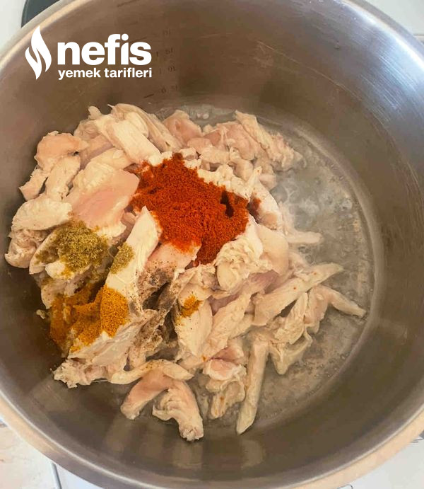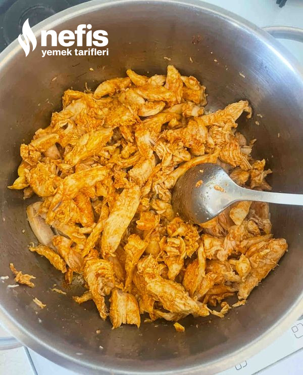 4. Tavuk haşlandıktan sonra lif lif ayıralım yahut jülyen biçiminde doğrayalım. Sonra bir tavaya yahut tencereye 2-3 yemek kaşığı ayçiçek yağını koyalım. Kırmızı toz bineri rengi hafif dönene kadar karıştıralım. Biber yanmasın.