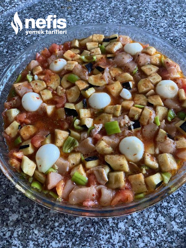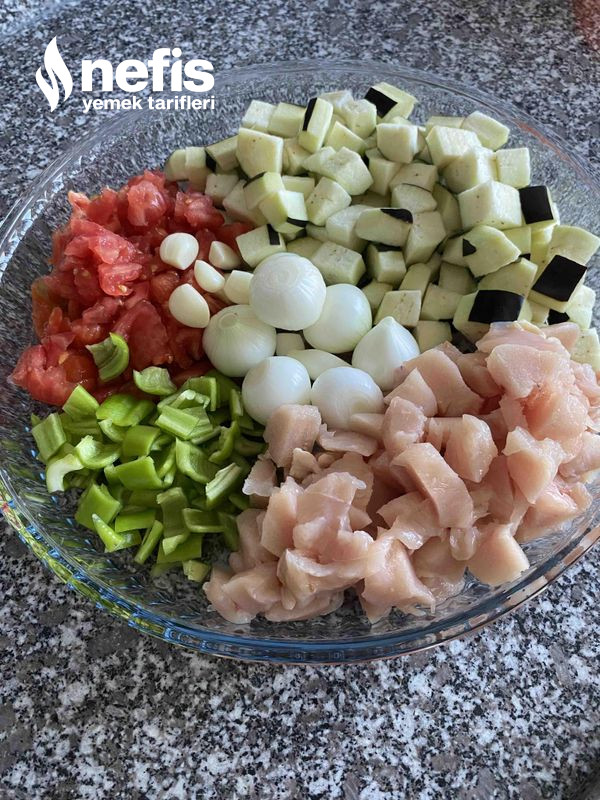 1. Öncelikle zerzevatları yıkayalım ve iri formda eşitçe doğrayalım. Tıpkı halde tavuğu da doğrayalım, zerzevatları tepsiye dizelim.