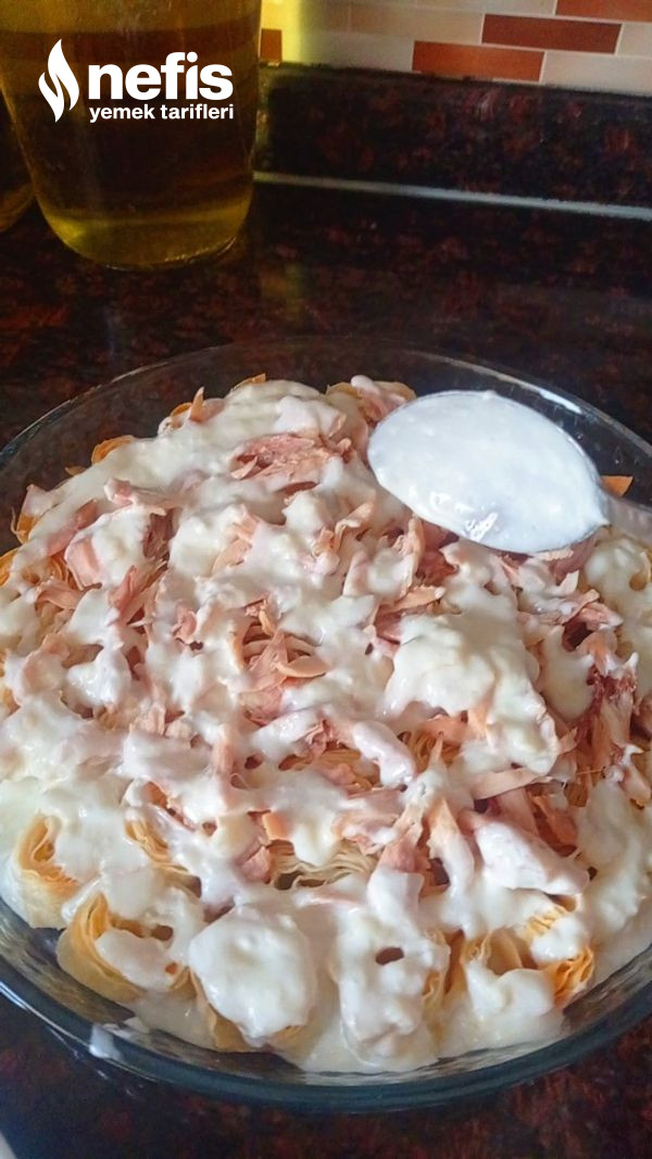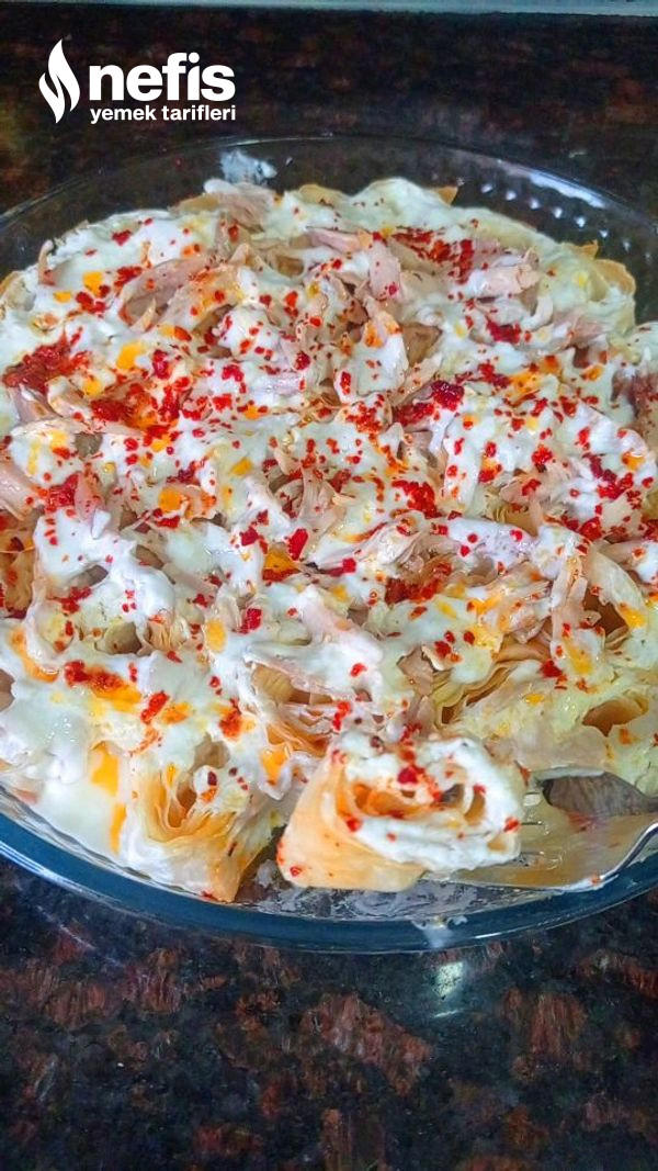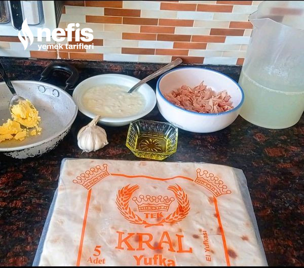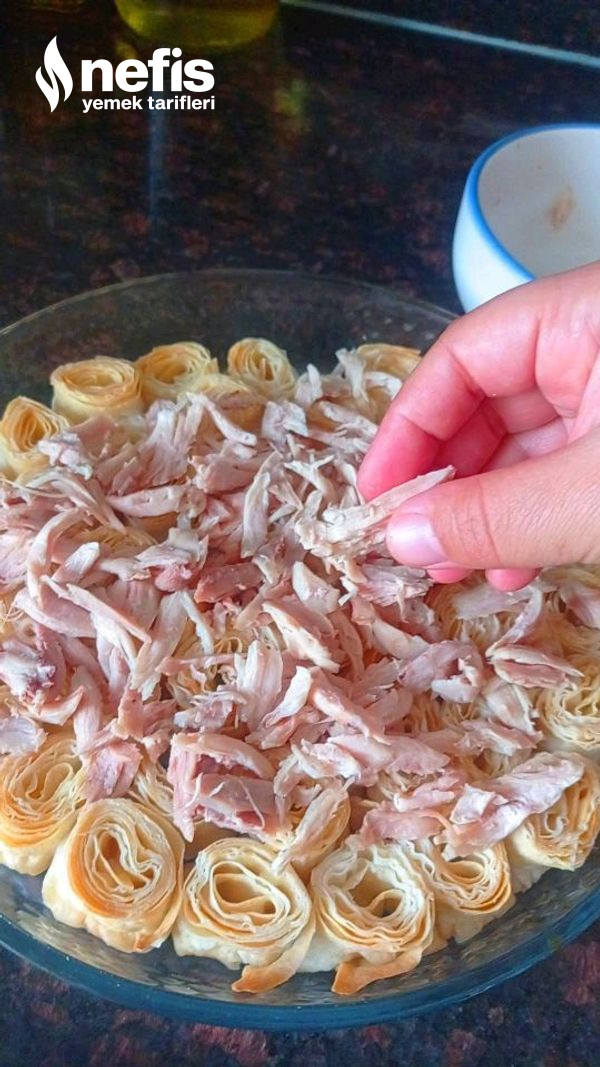 - Haşlandıktan sonra etimizi didikleyip bir kenara alalım ve suyunu da yufkaları ıslatmak için bir kenara alalım. Yufkalarımızdan bir adedini tezgaha serelim üzerine ayırmış olduğumuz tavuk suyu ile ıslatıp yumuşamasını sağlayalım.