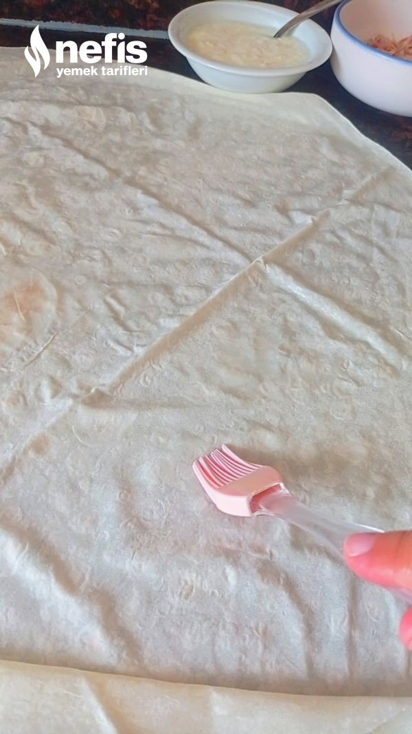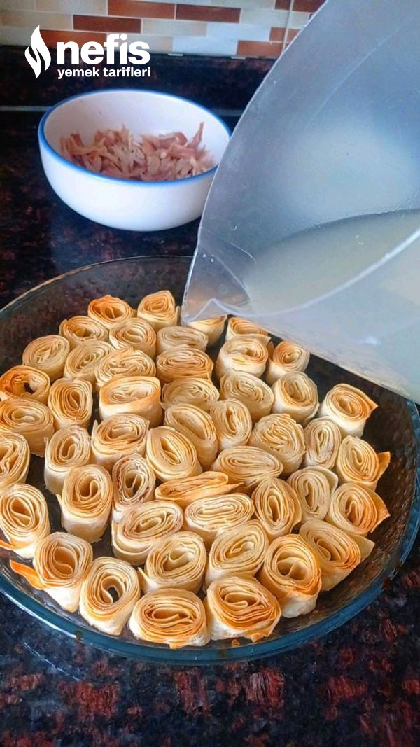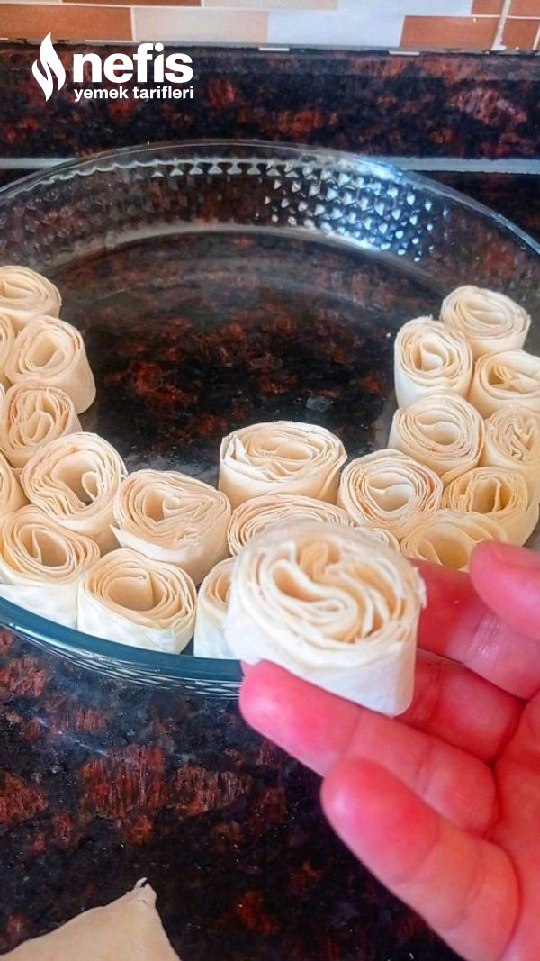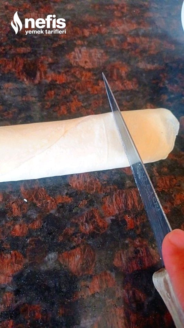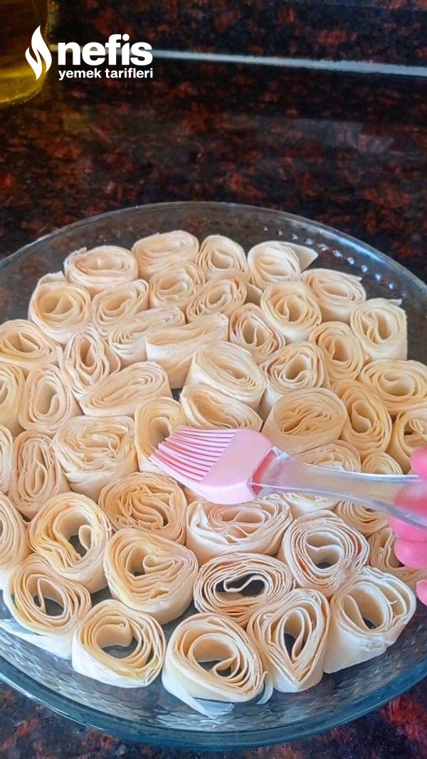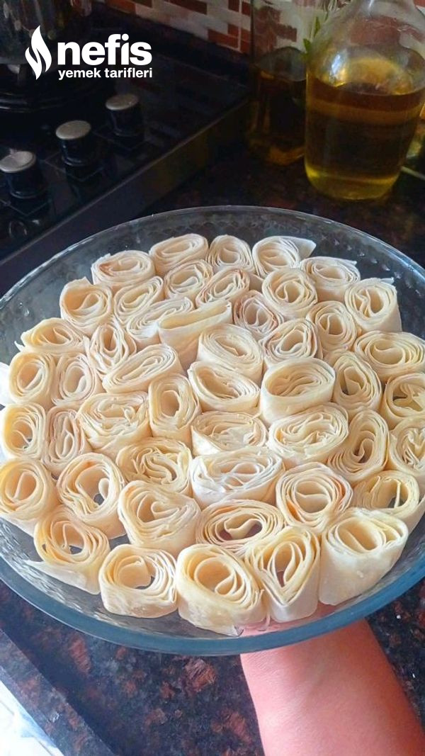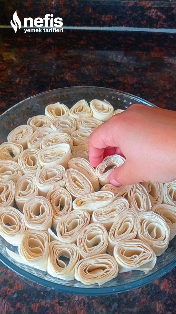 - Daha sonra rulo formunda yufkalarımızı saralım ve parmak kalınlığında keselim kesmiş olduğumuz yufkaları yağlamış olduğumuz yuvarlak bir borcama dizelim yufkamız bitene kadar bu sürece devam edelim.