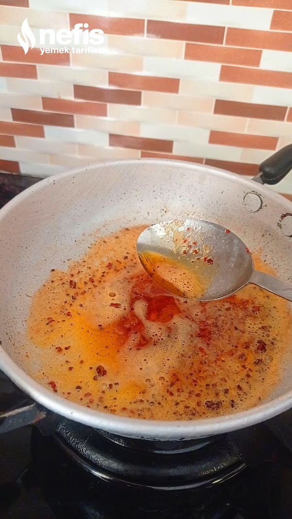 - Son olarak da bir küçük tavada tereyağını eritelim ve biraz da pul biber ekleyip karıştıralım ve ocaktan alın pul biber içinde yanmaması için çabucak ocaktan alalım ve onu da üzerine gezdirelim.