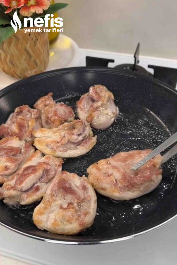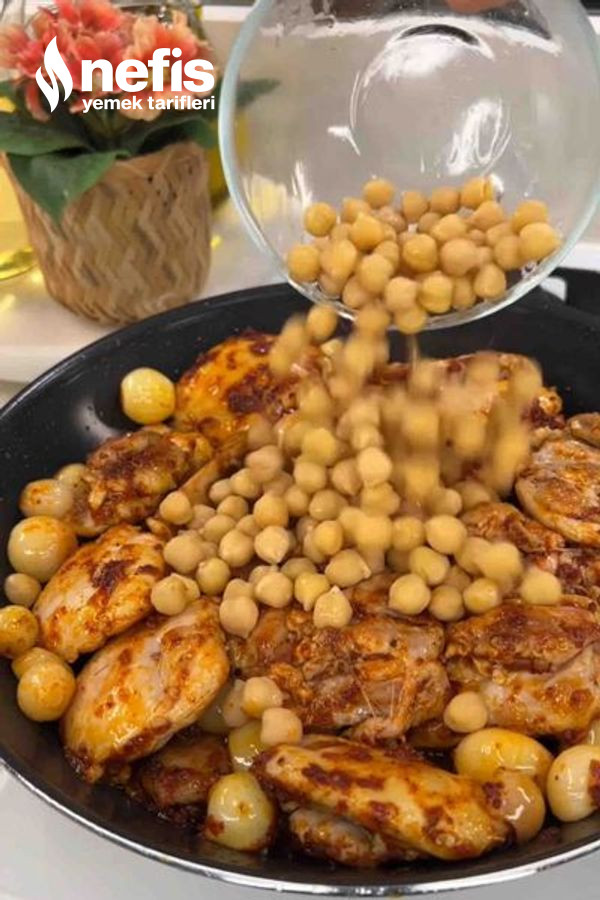 - Kızarttığımız tavuk ve haşlanmış nohutu ekleyip 2-3 dakıka karıştırıp suyunu ek edelim.